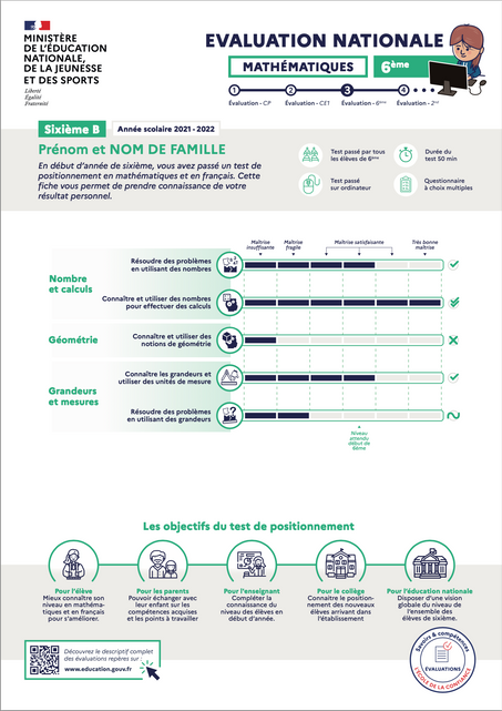Revisiter les modalités et les visuels des supports de restitution des évaluations nationales distribués chaque année aux parents des CP, CE1 et 6ème.